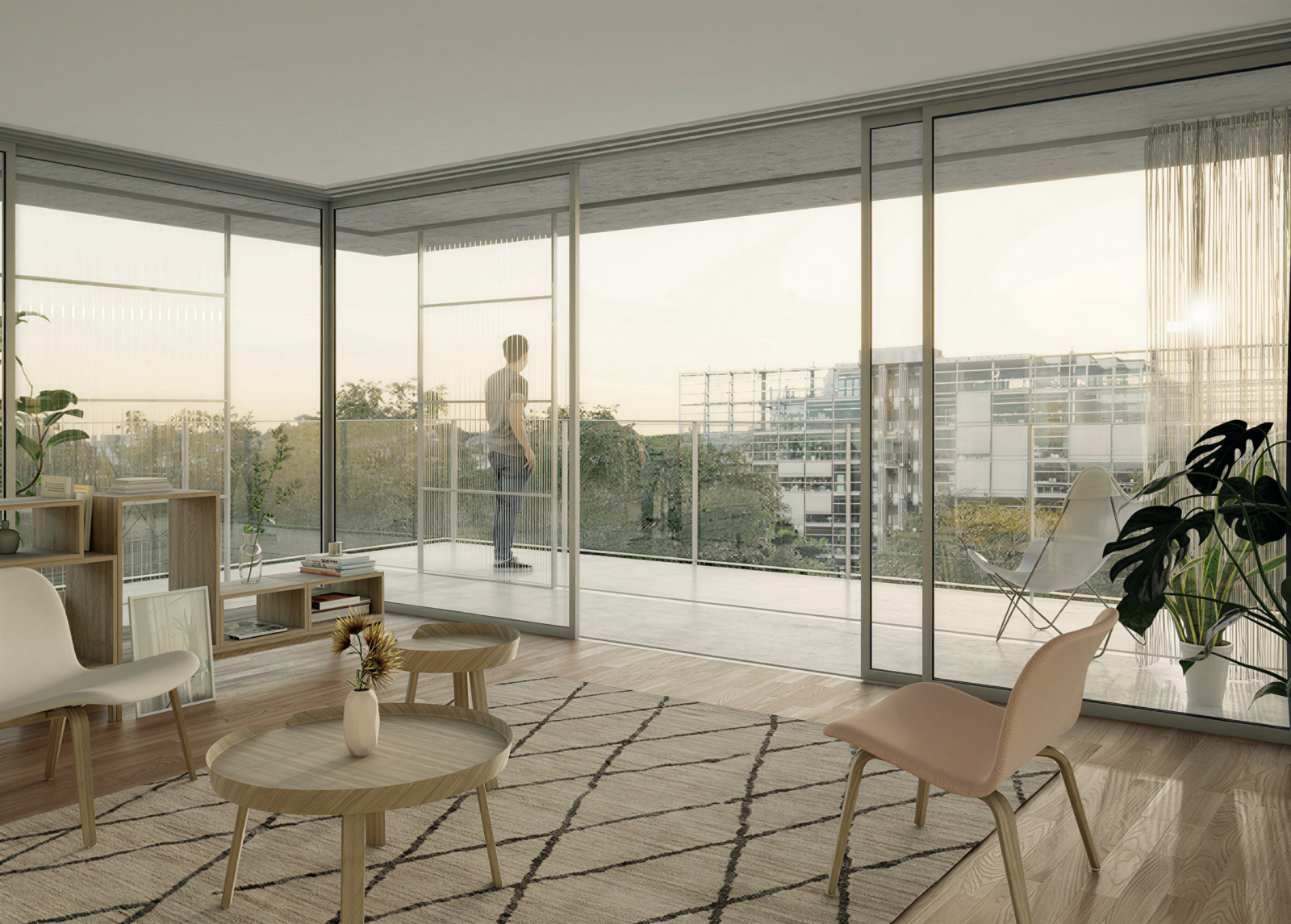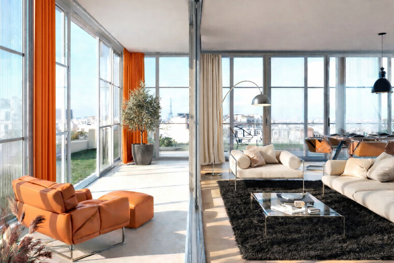 L’appartement s’organise autour d’un séjour avec cuisine ouverte de 26,3 m², largement ouvert sur le jardin d’hiver, offrant un espace de réception très agréable et une belle sensation de volume.