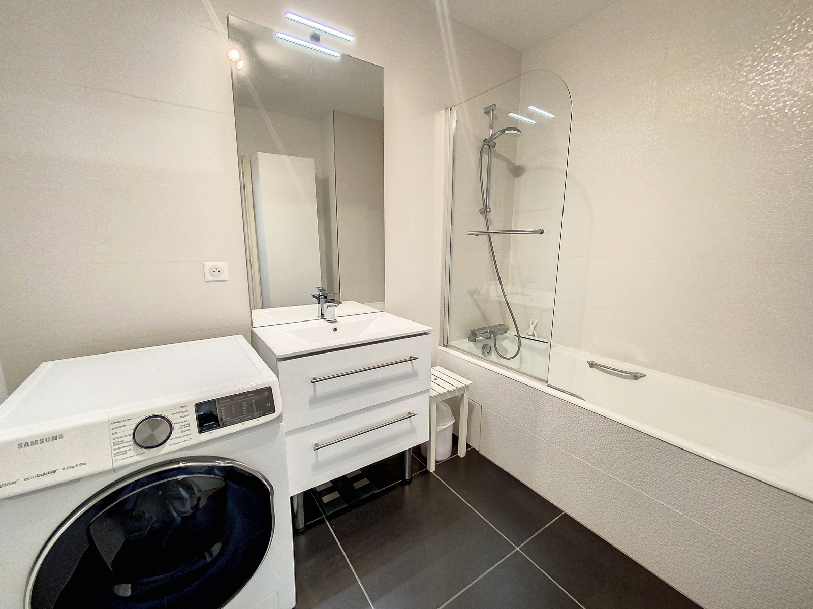 Exceptionnel 3 Pièces État Neuf - 3ème étage (sur 7) - ASC - Cave - possibilité de Parking.Dans l'immeuble « Spring Garden » de 2018, Bel appartement de 73m2 de 3 pièces en parfait état, composé d'une entrée avec placard, une belle pièce à vivre donnant sur une cuisine ouverte et équipée (plaques à induction, four vapeur, four micro-onde, plan de travail en Corian), 2 chambres, une salle de bains et WC séparés.